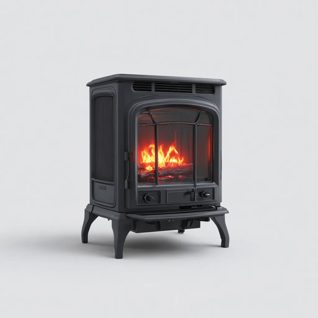 Realizzato in metallo verniciato nero con pannello frontale in vetro, presenta linee tradizionali e dettagli che richiamano le stufe a legna, mantenendo al contempo una struttura stabile.