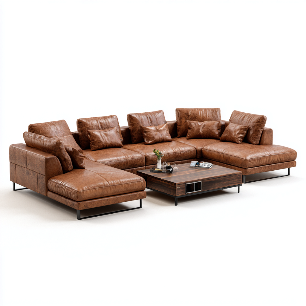 Questo set per soggiorno è composto da un divano modulare in pelle marrone e da un tavolino basso in finitura legno, creando un ambiente accogliente e contemporaneo. La seduta ampia e profonda offre un comfort ideale per momenti di relax quotidiano.
