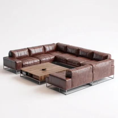 Questo set comprende un ampio divano modulare a forma di U in pelle e un tavolino quadrato in legno, progettati per creare un ambiente moderno e accogliente. Il divano offre una seduta estesa e uniforme, mentre il tavolino aggiunge funzionalità e uno stile naturale allo spazio living.