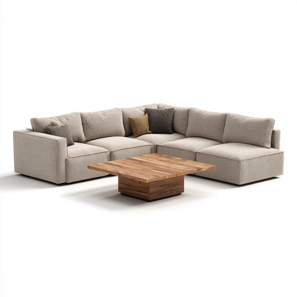 La configurazione modulare permette di adattare facilmente il divano allo spazio disponibile. Il tavolino offre una superficie stabile e ampia, ideale per oggetti quotidiani, libri e decorazioni.