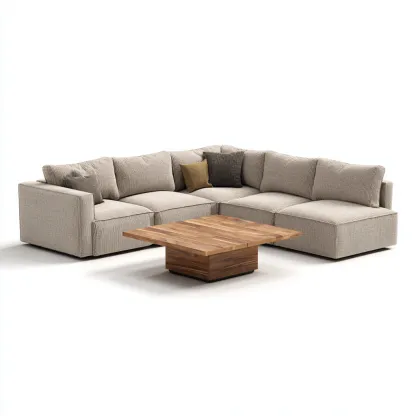 Questo set comprende un divano modulare in tessuto e un tavolino quadrato in legno, progettati per creare un soggiorno moderno, accogliente e funzionale. Il divano offre una seduta ampia e continua, ideale per momenti di relax, mentre il tavolino aggiunge praticità e coerenza estetica allo spazio.