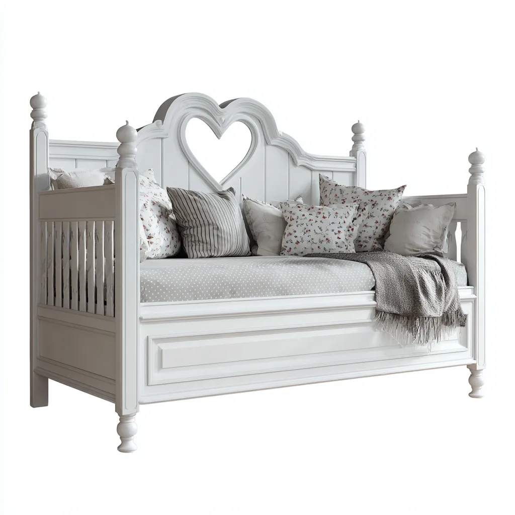 Questo divano letto in stile romantico è progettato per donare un tocco decorativo ed elegante alla camera da letto. La silhouette morbida e il motivo a cuore sulla testiera creano un'atmosfera accogliente e raffinata.