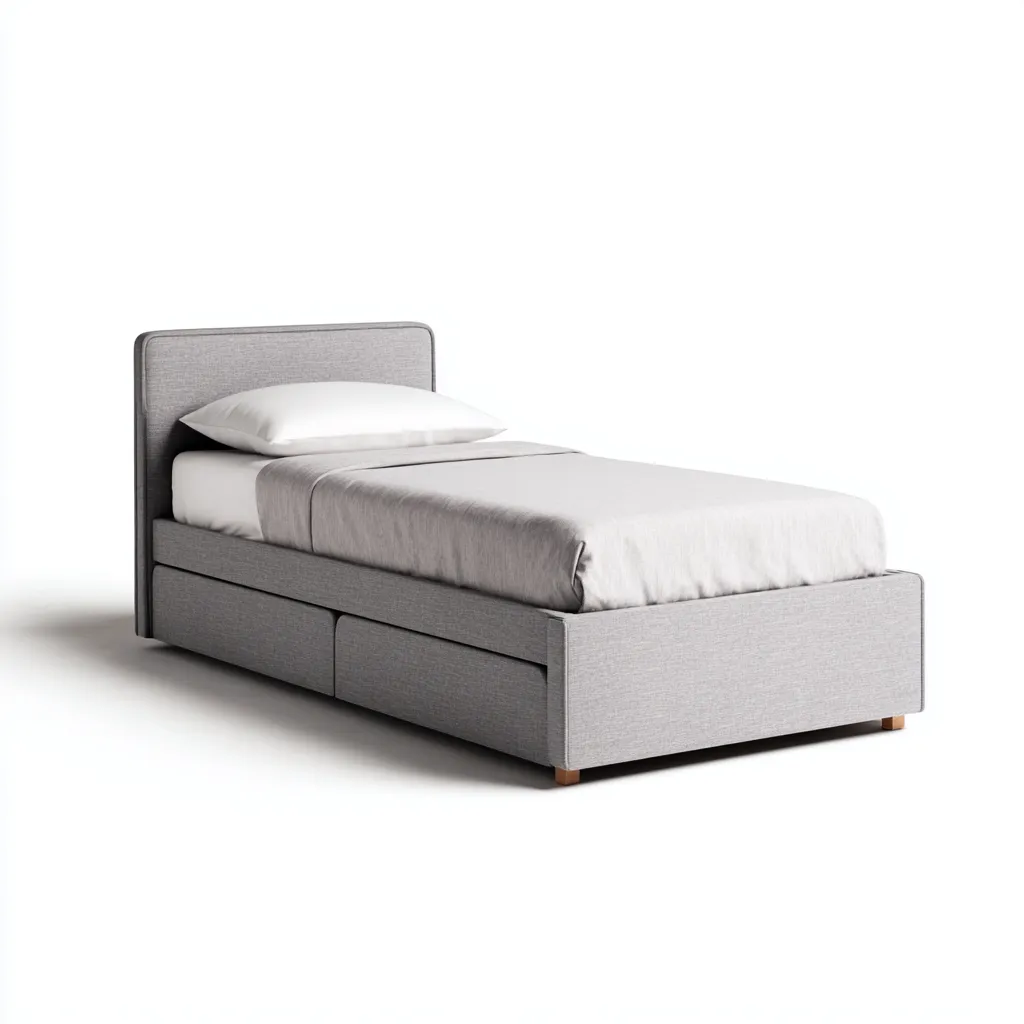 Questo letto singolo presenta una struttura imbottita in tessuto grigio con linee morbide e proporzioni compatte, ideale per la camera da letto moderna. Il design essenziale permette di integrarsi facilmente in vari ambienti domestici.