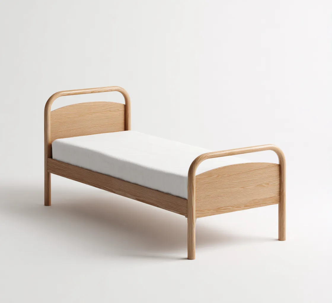 Questo letto singolo presenta una struttura in legno chiaro con linee morbide e arrotondate, ideale per creare un ambiente ordinato e accogliente in camera da letto. Il design minimalista si integra facilmente con vari stili di arredo.