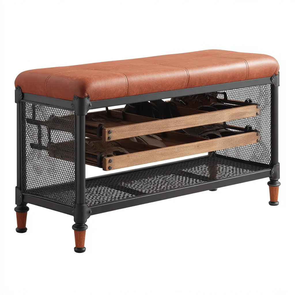 La panca è dotata di una seduta comoda e di una struttura inferiore che consente di organizzare calzature o altri oggetti di uso quotidiano. Il design aperto facilita l'accessibilità e favorisce la ventilazione.