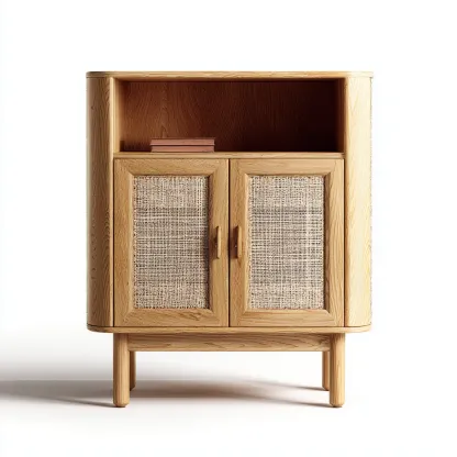 Realizzata in legno color marrone chiaro con ante in tessuto intrecciato, presenta una superficie liscia e resistente, ideale per un utilizzo quotidiano.