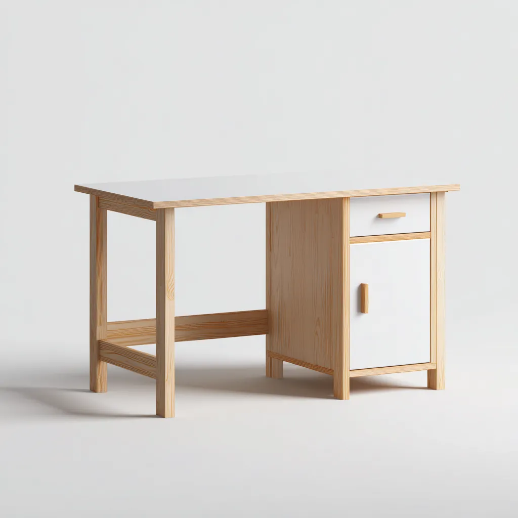 Il piano bianco è realizzato in materiale resistente e facile da pulire, mentre la struttura in legno naturale assicura solidità. Il cassetto e l'anta frontale facilitano l'organizzazione di piccoli oggetti e materiali scolastici.